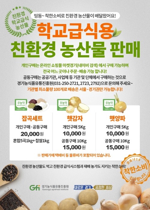 경기도와 경기농식품유통진흥원은 먼저 지난 19일부터 온라인 쇼핑몰 마켓경기에서 잡곡과 햇감자, 햇양파 등 친환경 학교급식 농산물 판매를 시작했다. 잡곡세트(혼합5곡 1kg와 참쌀 1kg)는 2만원, 햇감자와 햇양파는 5kg에 1만원, 공동구매로 사면 10kg에 1만5천원에 구매할 수 있다.