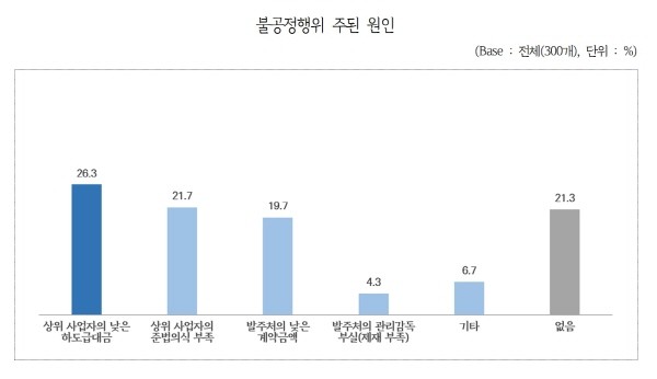 ‘불공정행위의 주된 원인’으로 업체들은 ‘상위 사업자의 낮은 하도급 대금’(26.3%)을 가장 많이 꼽았다. 이어 ‘상위 사업자의 준법의식 부족’(21.7%), ‘발주처의 낮은 계약금액’(19.7%), ‘발주처의 관리감독 부실’(4.3%) 등을 들었다.