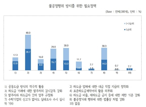 ‘불공정거래행위 방지를 위한 필요정책’으로는 ‘하도급 업체에 대한 대금 직접 지급 정착화’(28.7%)를 가장 많이 응답했다. 이어 ‘표준하도급 계약서 활용 의무화’(15.7%), ‘불공정거래행위에 대한 법률상 처벌 강화’(14.3%), ‘발주자와 하도급자 간 업무 규정화’(13.3%), ‘공동도급 방식의 적극적 활용’(12.0%), ‘발주처의 감시감독 강화’ 등이 필요하다고 답했다.