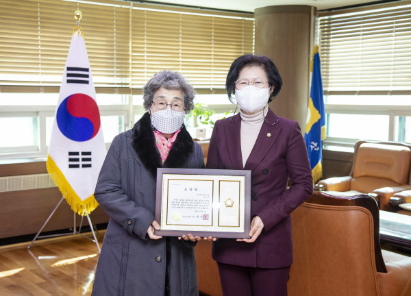 ▲ 안산시의회 박은경 의장이 지난 26일 의장실에서 광복회 안산시지회 회원이자 독립유공자 후손인 안인자(사진 왼쪽) 님에게 지역에서 애국정신을 고양한 공로로 표창장을 수여했다. |