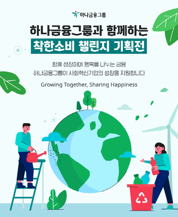 사회적 기업을 돕기 위한 ‘착한 소비 캠페인’은 네이버 해피빈과 함께 내년 1월 11일까지 진행한다. 하나금융그룹은 ESG 경영에 발맞추어 업사이클링 제품 개발 및 발달장애인들에게 일자리를 제공하는 10개의 사회적 기업을 선정하여 해피빈 펀딩을 지원한다. 자동차 폐기물을 업사이클링한 패션 잡화, 버려지는 농수산물을 이용한 반려동물 식품, 발달장애인들이 만드는 생활용품 등 다양한 종류의 상품을 선보일 예정이다.