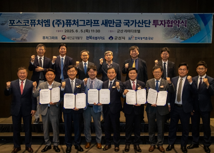 군산시와 새만금개발청ㆍ전북특별자치도ㆍ한국농어촌공사는 6월 5일 ㈜포스코퓨처엠 신설 자회사인 ㈜퓨처그라프와 ‘이차전지 음극재 핵심소재(이차전지 천연흑연 음극재의 핵심소재로 흑연 광석의 불규칙한 입자를 둥글게 하고 순도를 높인 중간원료) 제조시설 건립을 위한 투자협약(MOU)’을 체결했다고 밝혔다.