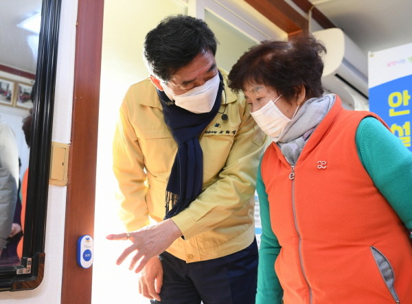 ▲ 안산시, 범죄예방 안심벨 설치 희망자 추가 모집 (윤화섭 안산시장이 지난 14일 와동 방죽말경로당에서 범죄예방 안심벨 1호를 설치하고, 사용법을 설명하고 있다. |