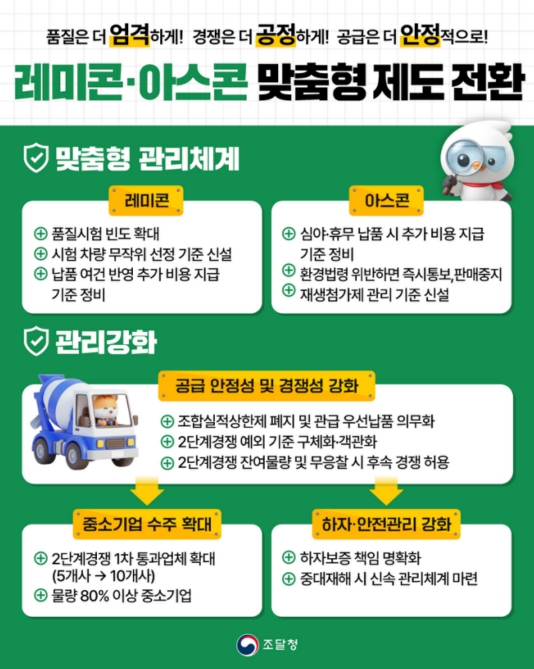 조달청은 레미콘·아스콘의 물품 특성을 반영한 맞춤형 제도 운영을 위해 관련 규정을 전면 개정하고 2026년 3월 1일부터 시행한다고 밝혔다.