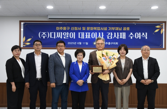 미추홀구의회는 지난 11일 미추홀구의회 세미나실에서 ㈜디씨알이 정창현 대표이사에게 감사패를 수여하는 뜻깊은 행사를 개최했다. 이번 감사패 수여식은 ㈜디씨알이가 미추홀구 신청사 및 문화복합시설 건립을 위한 기부채납을 통해 지역사회에 기여한 공로를 기리기 위해 마련됐다.