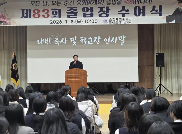 김정희 전남도의회 교육위원장은 1월 8일, 순천세빛중학교에서 열린 제83회 졸업식에 참석해 졸업생들의 새로운 출발을 축하하고, 전남교육의 미래를 향한 따뜻한 격려의 메시지를 전했다.