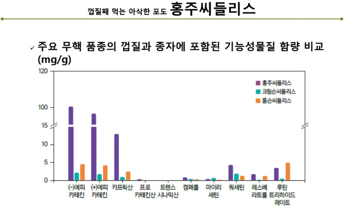 | ▲ 홍주 씨들리스. 주요 무핵 품종의 껍질과 종자에 포함된 기능성물질 함량 비교. |