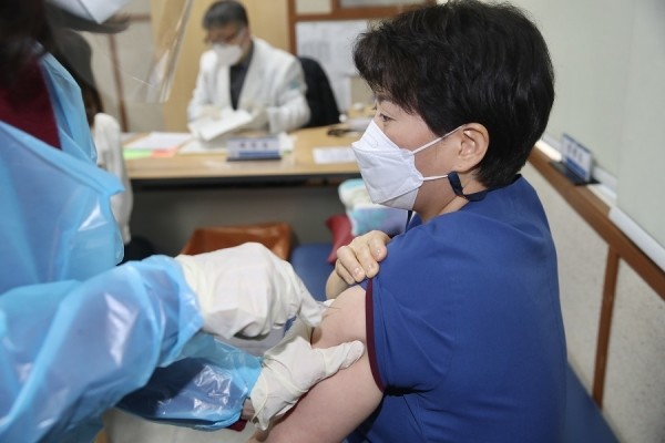 ▲ 26일 오전9시 천안시 코로나19 백신 첫 접종자 호서노인전문요양원 10년차 요양보호사 A씨가 아스트라제네카(AZ)를 접종받고 있다. (사진제공=천안시) |