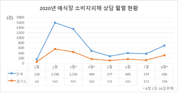 월별 상담추이를 보면 1월에는 60건이던 결혼식장 관련 상담이 코로나가 확산되던 2월 563건, 3월 447건으로 증가했다가 4월 이후 150건 전후로 감소했다. 그러나 수도권을 중심으로 코로나19가 재확산되면서 8월에만 20일까지 318건의 상담이 접수되는 등 큰폭의 증가세를 보이고 있다.