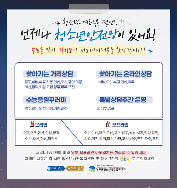 경기도는 수능전후 청소년안전망 강화를 위해 도내 청소년유관기관 47개소와 연합해 12월 11일까지 ‘찾아가는 수험생 응원’을 진행한다.