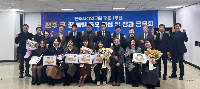 이어 우수상은 도시미학과 청년 정주 문제에 대한 창의적 접근이 돋보인 ‘빅데이터 AI 기반 전주시 공공조형물 특성 연구’와 ‘청년층의 공동체 의식이 정주의사에 미치는 영향’이 각각 선정됐으며, 반려동물 친화 정책을 통해 시민 생활의 질을 향상시키려는 독창적인 아이디어가 돋보인 ‘전주시 반려동물 환경 분석 및 정책 제안’이 특별상을 받았다.