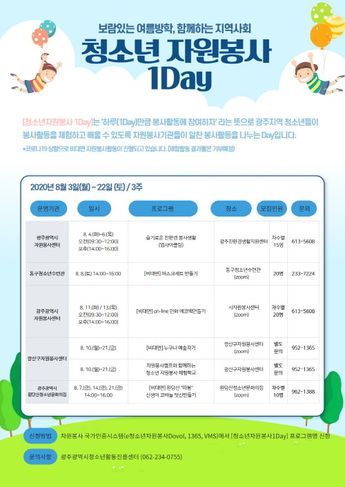 『청소년자원봉사 1Day』란 청소년이 봉사활동을 체험하고 배울 수 있도록 자원봉사기관들이 알찬 봉사활동을 나누는 활동으로 봉사활동기관들과 함께 여름방학을 맞이하여 청소년들에게 다양한 자원봉사 일감을 제공하고 청소년들이 지역사회 문제를 해결하기 위한 나눔 실천으로 지역 청소년자원봉사 활성화를 위해 8. 3.(월) ~ 22(토) 3주 동안 진행된다.
