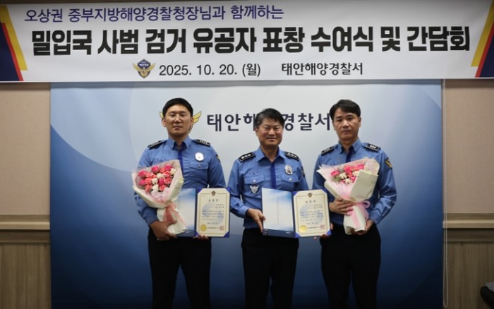 중부지방해양경찰청은 지난 20일, 태안해경서 소회의실에서 최근 태안 해상에서 발생한 밀입국 사범 검거와 관련해 유공자 표창 수여 및 간담회를 개최했다고 밝혔다.
