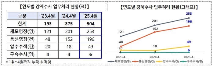 고용노동부에 따르면 ’25년 4월 기준으로 구속수사, 체포영장 집행 등 강제수사 실적이 504건으로 지난해 같은 시기에 비해 크게 증가(34.4%)한 것으로 확인됐다. 이는 ’23년 4월(193건)과 비교하면 무려 2.6배나 증가한 수치이다.