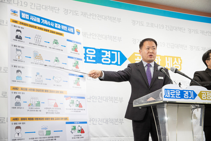 한편, 민선 7기 시작과 함께 ‘불공정.불법 행위가 없는 공정한 경기 실현’을 위해 2018년 10월 신설된 공정특별사법경찰단은 고금리 사채 등 불법 사금융 근절에 집중하고 있으며, 지난해 온라인 고금리 불법 대부조직 등 불법 대부업자 46명을 적발했다. 주요 적발사례로는 ▲연 이자율 최고 3만1천%의 살인적인 고금리 불법 대부조직 ‘황금대부파’ 검거 ▲92억 원 상당 거액의 불법 고금리 대부행위 ▲배달대행업 등 저신용 서민 대상 불법 고금리 대부행위자 검거 등이 있다.