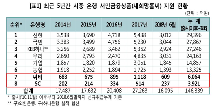 외국계 은행인 씨티은행과 SC제일은행의 새희망홀씨 지원액은 최하위에 머물렀다. 두 은행의 지원금은 전체 새희망홀씨 지원 누계액의 6.7% 수준에 불과하며, 가장 많은 지원액을 기록한 신한은행의 33% 수준이다.