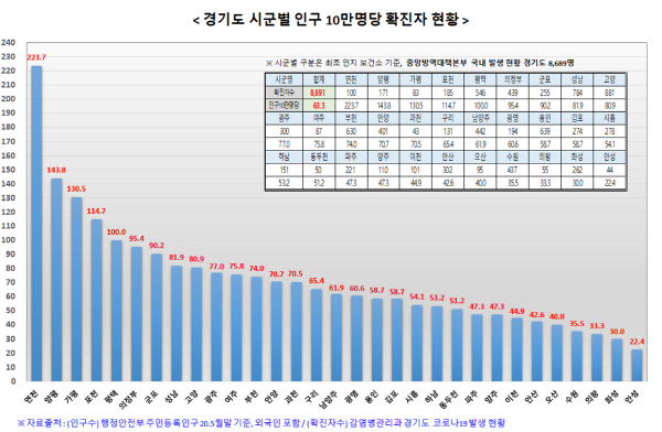 9일 0시 기준 경기도 확진자 수는 전일 대비 219명 증가한 총 8,691명으로, 도내 26개 시군에서 확진자가 발생했다. 신규 확진자의 감염경로를 보면 안양시 종교단체 관련 3명, 군포시 소재 원광대 산본병원 관련 4명 등이다. 신규 확진자 중 60세 이상 고령자는 80명으로 36.5%를 차지하고 감염경로를 알 수 없는 확진자는 28.3%인 62명이다.