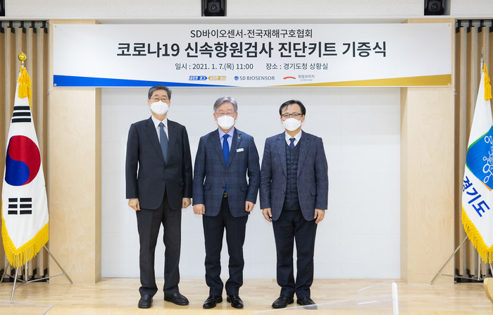 이재명 경기도지사는 7일 경기도청 상황실에서 이효근 SD바이오센서 대표이사, 송필호 희망브리지 전국재해구호협회 회장이 참석한 가운데 코로나19 신속항원검사 진단키트 기증식을 진행했다.