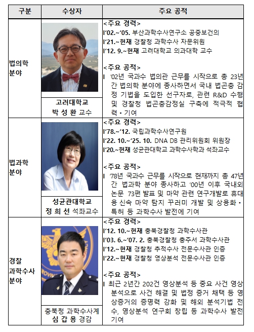 | ▲ 「제21회 과학수사대상」 수상자 약력 |