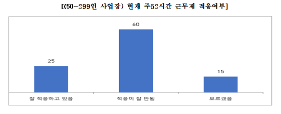 조사 내용을 보면, 현재 주52시간 근무제 계도기간을 적용중인 50인 이상 300인 미만 사업장 중 주 52시간제에 ‘적응이 잘 안 되고 있다’(60%)는 응답이 ‘잘 적응하고 있음’(25%)보다 두 배 이상 높게 나타났다.