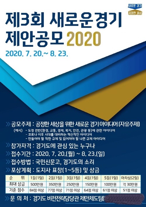 경기도는 8월 23일까지 제3회 ‘새로운 경기 제안공모 2020’을 진행한다고 21일 밝혔다.