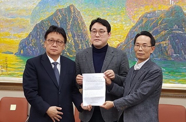 | ▲ (왼쪽부터) 민병두 정무위원장, 김형선 금융노조 기업은행지부 위원장, 허권 금융노조 위원장. <사진=금융노조 제공> |