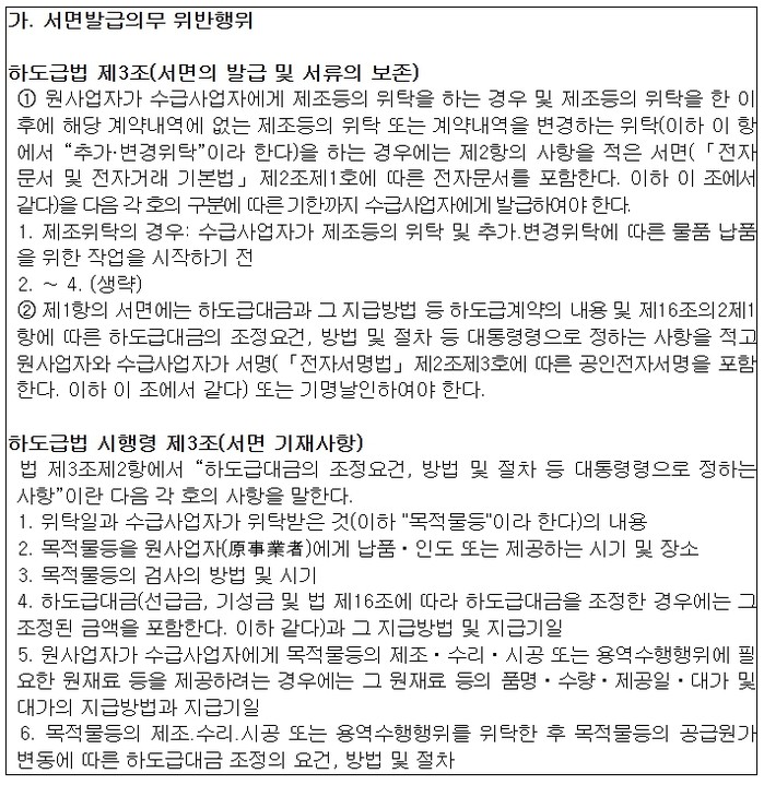 하도급법이 법정기재사항을 적은 서면을 작업을 시작하기 전에 발급하도록 규정한 것은 원사업자와 수급사업자간의 권리와 의무사항을 분명히 하여 장래에 발생할 수 있는 분쟁을 사전에 예방하고 원사업자의 자율적인 법 준수를 확보함과 아울러 분쟁의 해결을 용이하게 하는 데 그 목적이 있다.