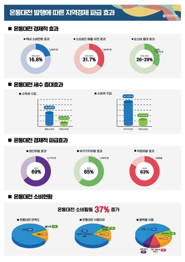 온통대전의 지역경제 파급효과를 보면, 온통대전 발행으로 인한 세수 증대 효과는 종합소득세 42억원, 지방소득세 4억2천만원이 증가한 것으로 나타났다.