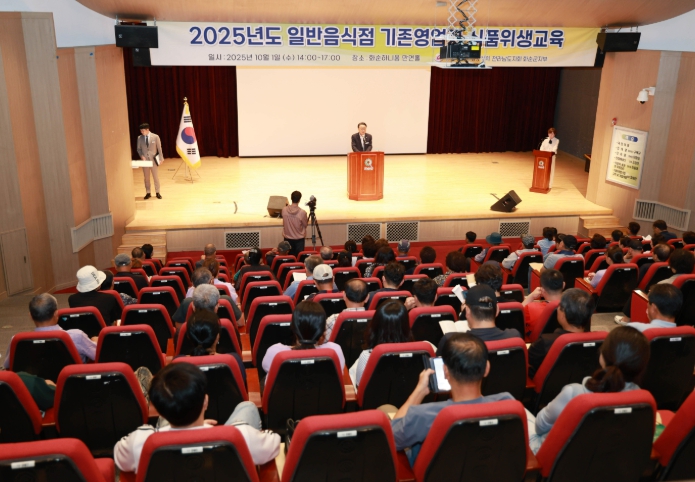 화순군과 (사)한국외식업중앙회 전라남도지회 화순군 지부(지부장 이향심)는 지난 10월 1일 하니움스포츠문화센터 만연홀에서 관내 일반음식점 영업주 200여 명을 대상으로 '2025년도 일반음식점 영업자 위생교육을 진행했다.