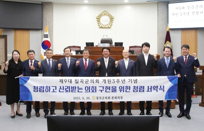 이번 서약식은 제9대 칠곡군의회 개원 3주년을 맞아 그동안의 의정활동을 되돌아보고, 공직자로서의 기본 책무인 청렴의 가치를 되새기기 위해 마련됐다.