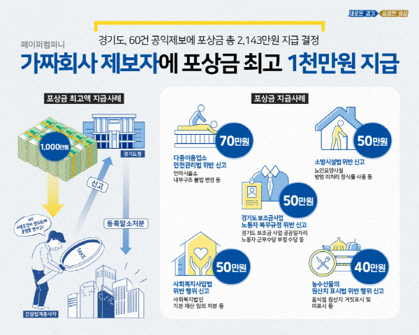 도는 지난 12일 2020년도 제3차 경기도 공익제보지원위원회를 열고 이를 포함해 모두 60건의 공익제보에 대해 2,143만원의 포상금을 지급하기로 결정했다.