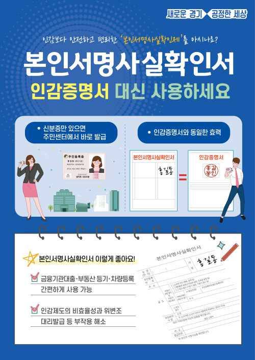 경기도가 인감제도의 비효율성과 위변조, 대리발급 등의 부작용을 해소하기 위해 도입된 ‘본인서명사실확인제’ 활성화를 위해 적극적인 홍보활동과 함께 인감증명서를 요구하는 행정 제도 개선을 추진한다.