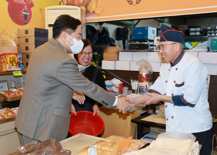 | ▲ 전북특별자치도가 내수 침체 장기화로 어려움을 겪고 있는 도내 소상공인과 자영업자 등을 지원하기 위해 ‘착한 선결제 캠페인’을 2월 28일까지 추진하는 가운데 14일 김관영 도지사가 착한가격업소로 지정된 전주 빵굽는나라에서 착한 선결제 및 재방문 약속하고 있다 |