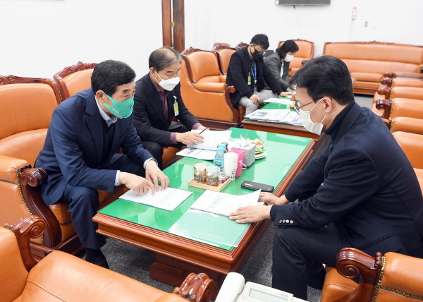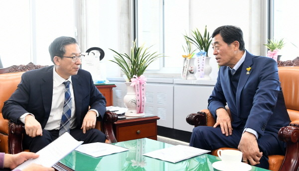 | ▲ 윤화섭 안산시장이 10일 김민석 국회 예결위원(보건복지위원장)과 면담하고 있다 |