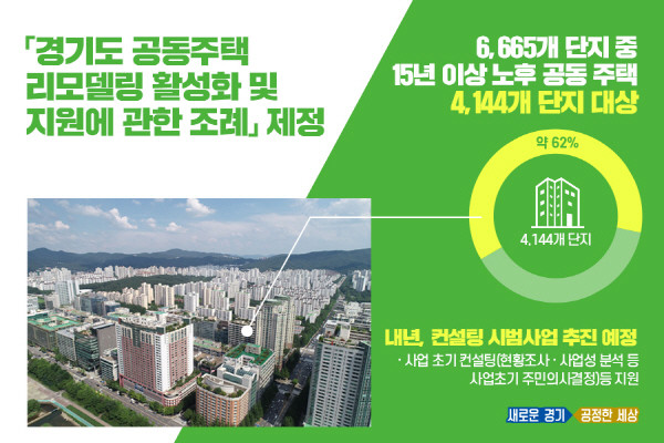 도는 도민의 70%(430만 세대중 300만세대) 이상이 거주하는 공동주택의 노후화 가속에 대한 대책 필요성을 인식하고 이재명 경기도지사 공약에 따라 전문가 자문.관련 기관 협의.주민 의견청취 등 준비과정을 거쳐 이번 조례를 마련했다.