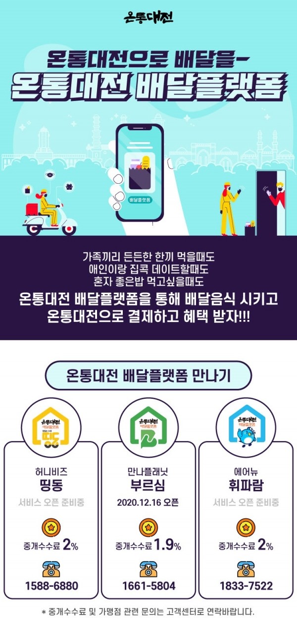 온통대전 배달플랫폼이란, 2% 이하의 낮은 중개수수료로 운영하는 민간앱을 활용해 소상공인의 부담을 덜고 시민들에게는 온통대전의 온라인 사용을 지원하는 민관협력 공정모델 사업이다.