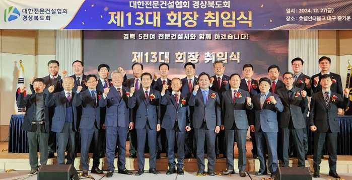 대한전문건설협회 경상북도회는 27일 인터불고호텔 대구에서 김학홍 경상북도 행정부지사, 배한철 경상북도의회 전반기 의장, 이성수 대한전문건설협회 수석부회장을 비롯한 시·도회장, 시군협의회장 등 150여 명이 참석한 가운데 제13대 최진현 회장 취임식을 개최했다.