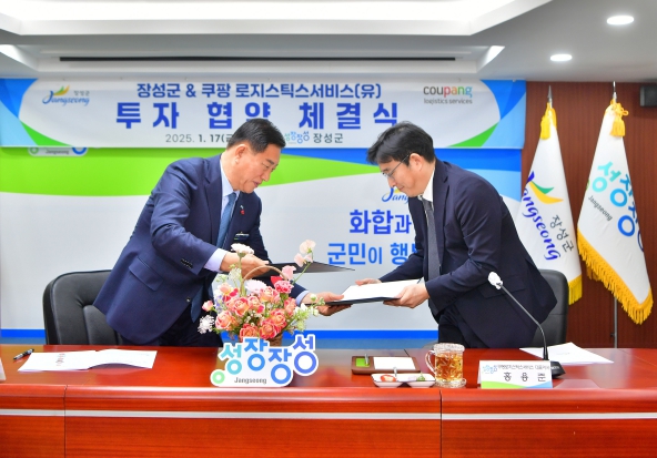 장성군이 새해 고용 창출과 경제 활성화의 신호탄을 쐈다. 군은 17일 군청 상황실에서 쿠팡로지스틱스서비스 유한회사와 ‘장성 서브허브’ 신설 투자협약을 체결했다. 김한종 장성군수, 홍용준 CLS 대표, 이개호 국회의원 등 관계자 10여 명이 협약식에 참석했다.