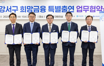 | ▲ 서울 강서구(구청장 진교훈)가 26일(수) 구청 대회의실에서 우리·하나·신한은행·서울신용보증재단과 ‘중소기업·소상공인 융자지원을 위한 업무협약’을 체결했다. 왼쪽부터 김영민 신한은행 강서본부장, 조세형 우리은행 기관그룹장, 진교훈 구청장, 홍경택 하나은행 서부영업본부 지역대표, 박장혁 서울신용보증재단 사업전략부문 상임이사 |
