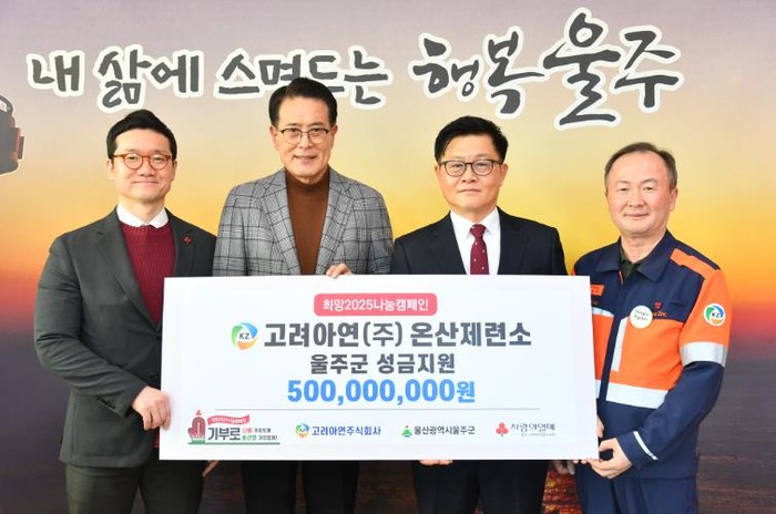 고려아연㈜이 10일 군청 소회의실에서 이순걸 군수, 고려아연㈜ 김승현 부사장, 울산사회복지공동모금회 양호영 사무처장 등 관계자들이 참석한 가운데 울주군에 성금 5억원을 전달했다.