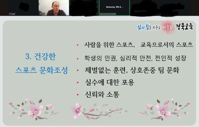 경북교육청은 25일 본청 4층 스마트오피스에서 도내 학교운동부지도자 300여 명을 대상으로 학생 선수 인권 보호와 (성)폭력 예방을 위해 화상(ZOOM) 교육을 실시했다고 밝혔다.