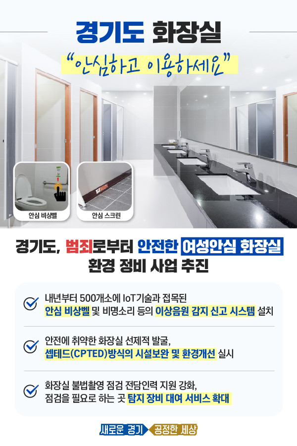 경기도에는 현재 1만689개소의 공중화장실이 있으며 이 가운데 비상벨이 설치된 곳은 1,960개로 18%에 이른다. 도는 관할 경찰서와 협력해 특히 범죄에 취약하고 시설개선을 필요로 하는 공중화장실을 추가 선정해 안심비상벨과 이상음원 감지시스템 등을 지원할 계획이다.