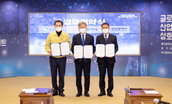 경기도와 광주광역시, 부산광역시는 29일 광주광역시청에서 ‘인공지능 헬스케어 플랫폼 구축’ 결성식을 개최했다. 이날 결성식에는 이재명 경기도지사를 비롯해 이용섭 광주광역시장, 김윤일 부산시 일자리경제실장, 김사열 국가균형발전위원장 등이 참석해 초광역 협력 프로젝트를 통한 지자체간 협력을 다짐했다.