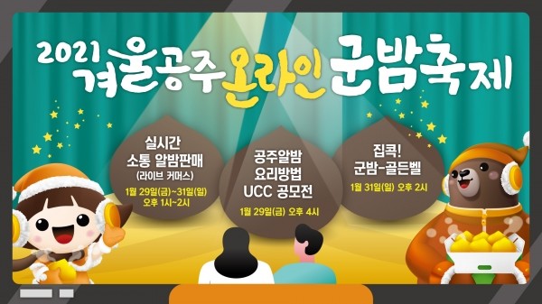 20일 공주시에 따르면, 군밤축제 조직위는 지난 18일 군밤축제 조직위원회를 개최하고 군밤축제 방식과 운영 등에 대한 논의 결과 코로나19 예방차원에서 오는 19일부터 3일간 온라인으로 개최하기로 최종 결정했다고 밝혔다.