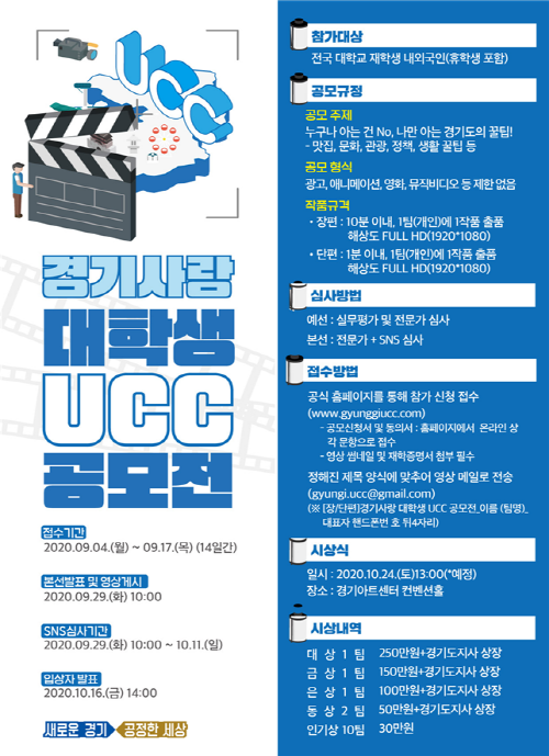 공모전 접수방법, 심사기준 등 자세한 내용은 경기사랑 대학생 UCC공모전 홈페이지를 참조하면 된다.