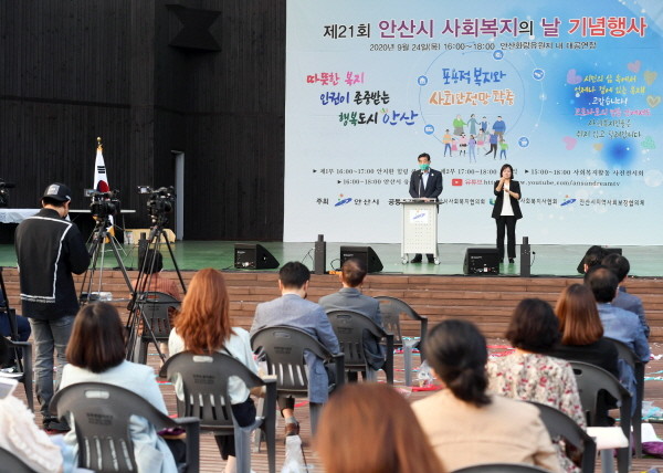 안산시사회복지협의회와 안산시사회복지사협회, 안산시지역사회보장협의체 주관으로 화랑유원지 대공연장에서 진행된 오프라인 행사에는 최소한의 인원이 참석했다. 온라인을 통해서도 500여 명이 지켜보며 사회복지의 날 기념식을 축하했다.
