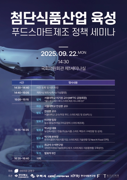 경북도는 22일 국회의원회관 제1세미나실에서 강명구 국회의원과 공동으로 ‘첨단식품산업 육성 푸드 스마트제조 정책 세미나’를 개최했다.