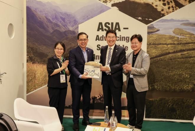 ▲ 지난 9일 아랍에미리트 아부다비에서 노관규 순천시장이 딘도 캄필란(Dindo Campilan) IUCN 아시아지역책임자와 양자회담을 갖고 기념사진을 촬영하고 있다 |