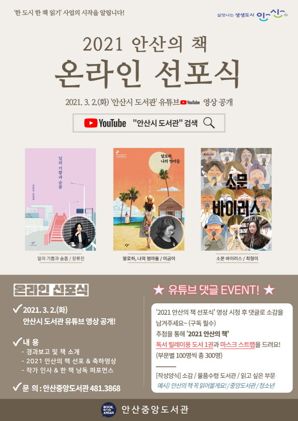 선포식 후에는 작가 3인의 인터뷰 영상이 주 1회 시민들을 찾아갈 예정이며, 이달 16일까지 ‘2021 안산의 책’ 독서릴레이 첫 주자를 모집하는 댓글 이벤트도 진행된다.