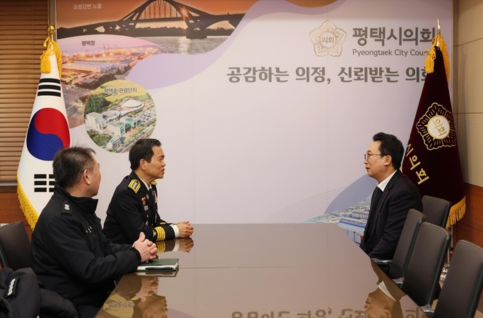 평택시의회 강정구 의장은 7일, 시의회 의장실에서 김승남 송탄소방서장을 접견해 시민의 안전에 대해 논의했다.